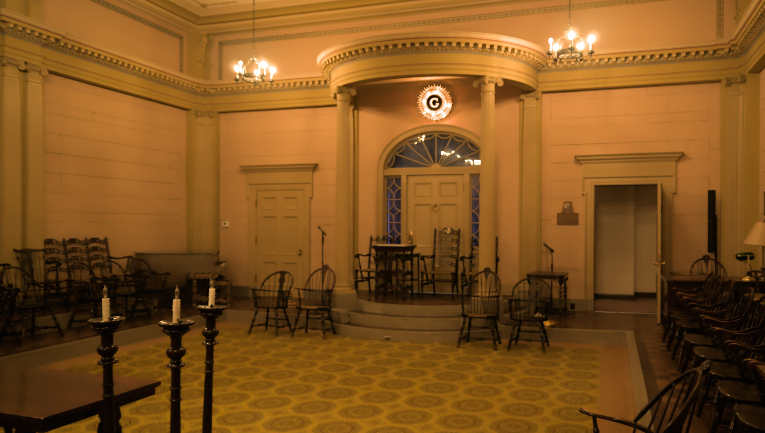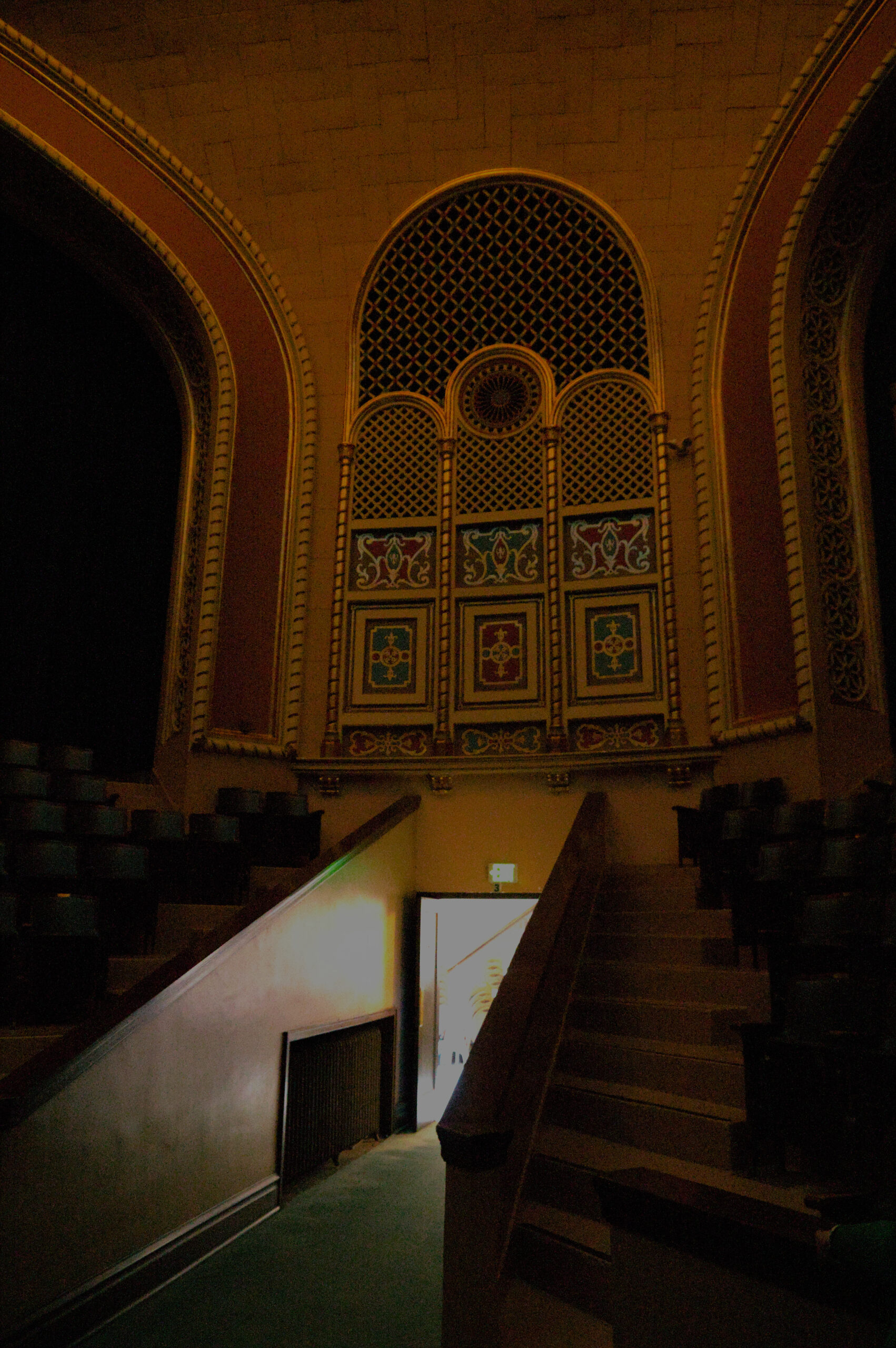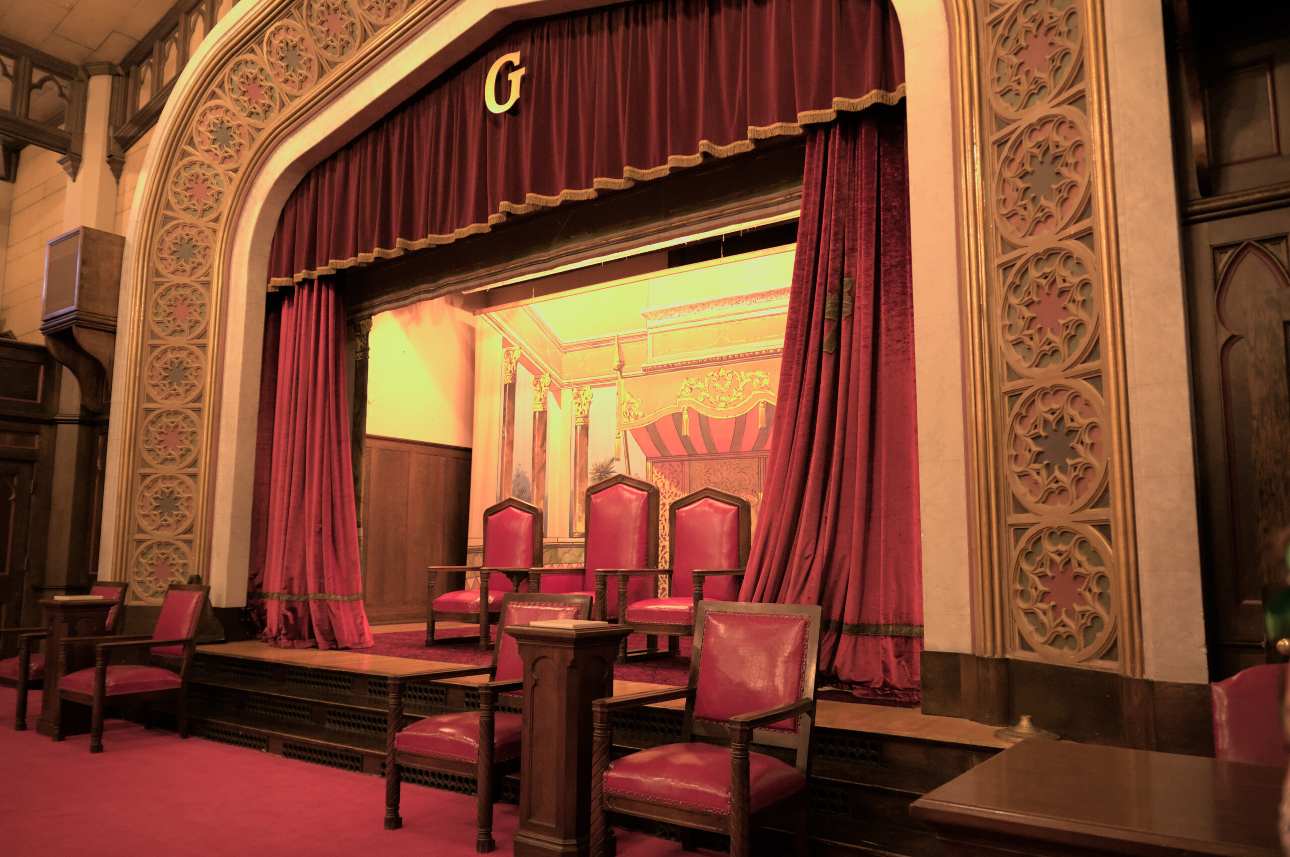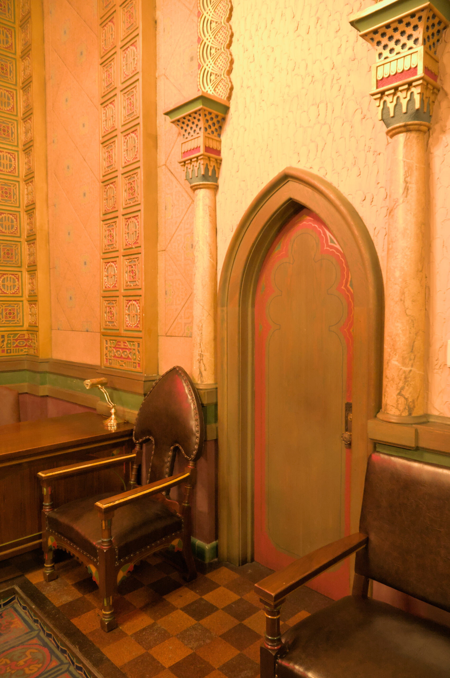In the lodge there are several rooms to perform the rituals, or meetings, or appointing of new members. I was a DeMolay back in high school, but I wasn’t very active. I enjoyed it, but my mind was usually on riding my bike, or finding a way to “pass” a class with out doing more homework. The next room was an Egyptian themed room (and it was also called “The Egyptian” room). I took a few pictures in there, but they’re not worth pointing out individually. The colors were good in person, but my white balance made all these images appear to be very yellow (It was very yellow in there, due to the old lighting, architecture, and colors from when this building was built).