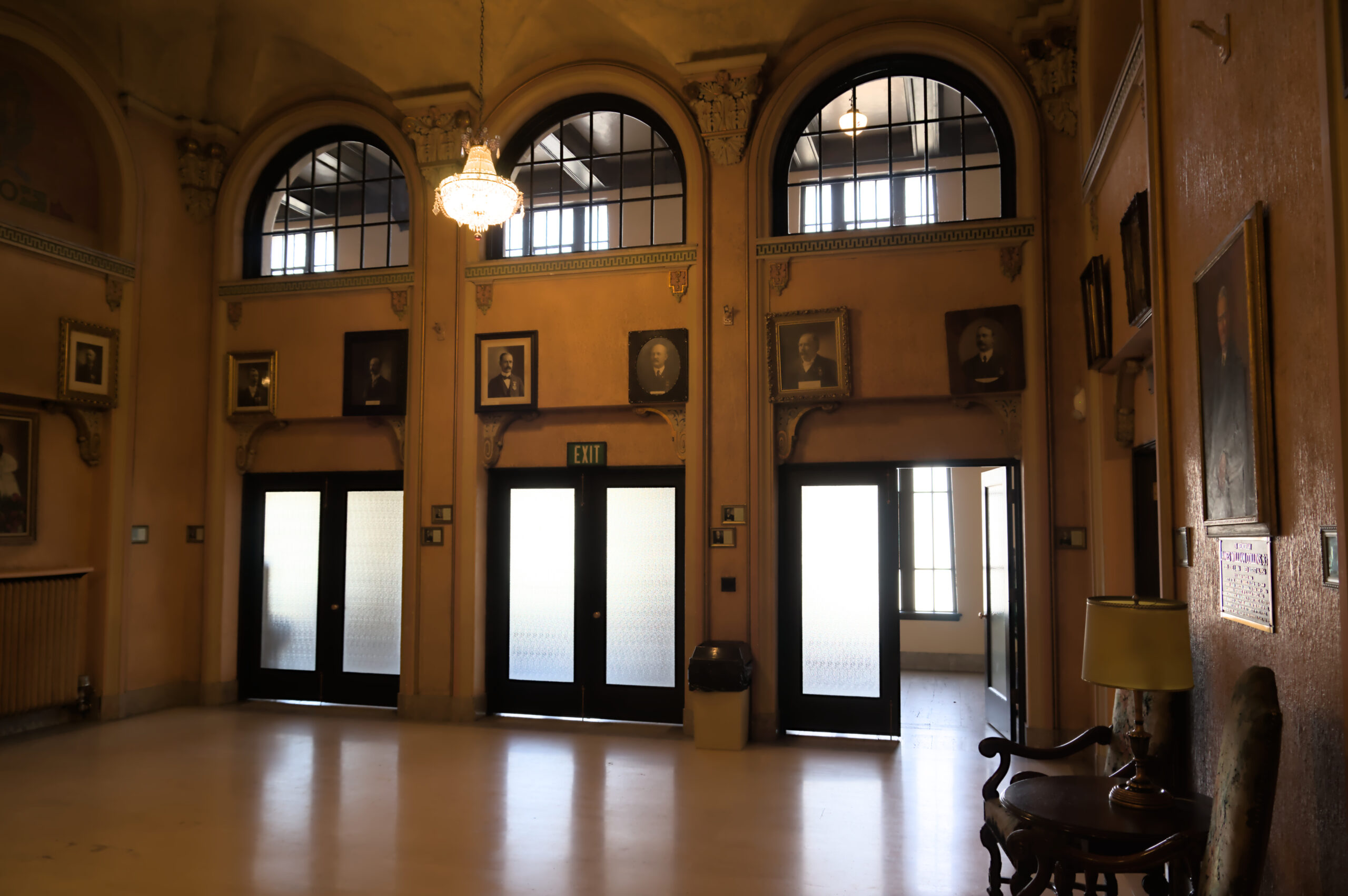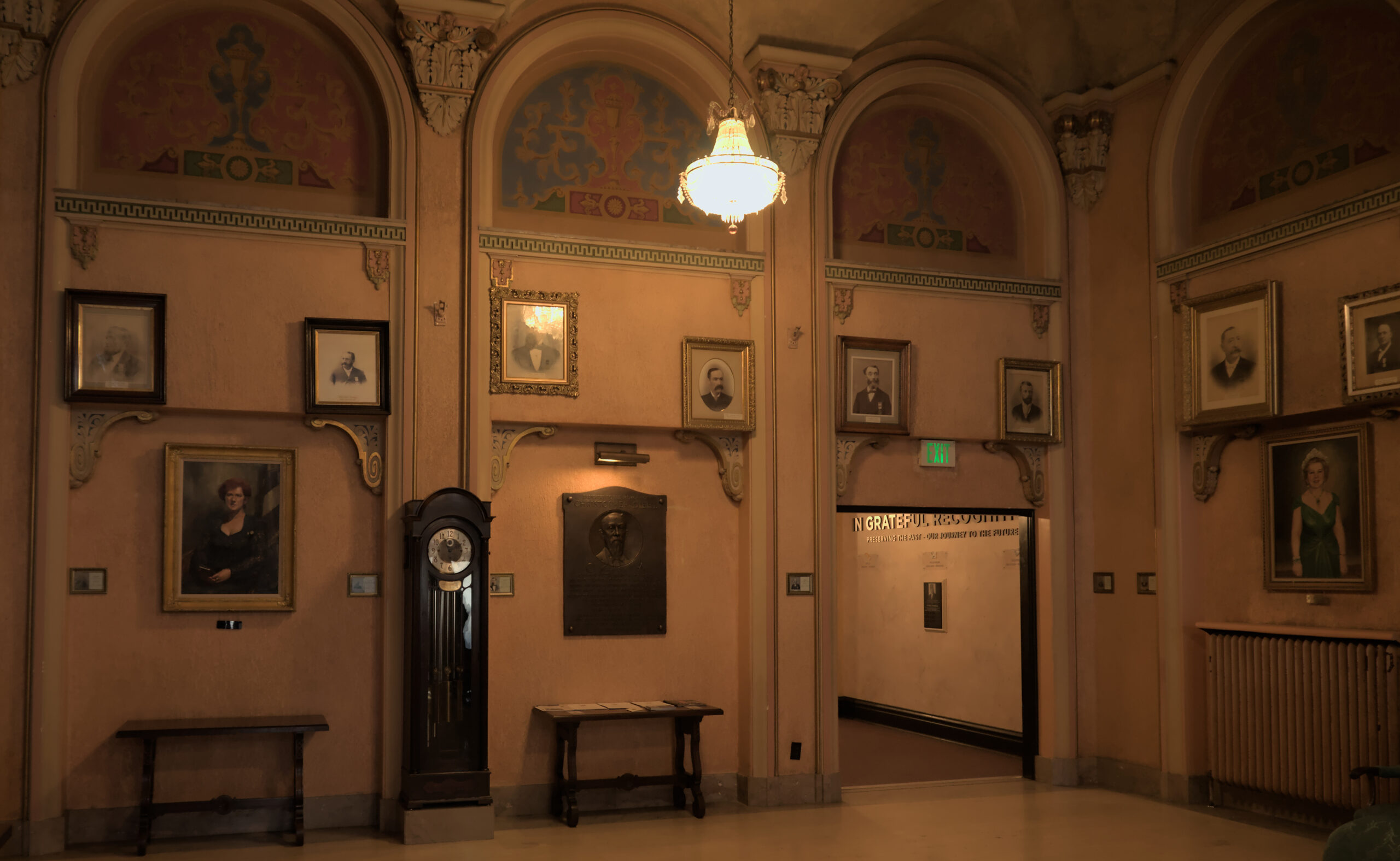 The Foyer was a pretty good sized rooms. LOTS of pictures of past Masons and Jobs. Some prominent figures from Utah and Salt Lake City, and of course, more than one of George Washington. I hung out on one of the chairs, watched people come and go, looked around, and took a few pictures. The picture of the crystal light IS the light hanging over the couch I was sitting on. I just sped up the shutter speed to the point it made the surrounding portions of the image black. Doesn’t matter, I like it, so it’s here 🙂 .