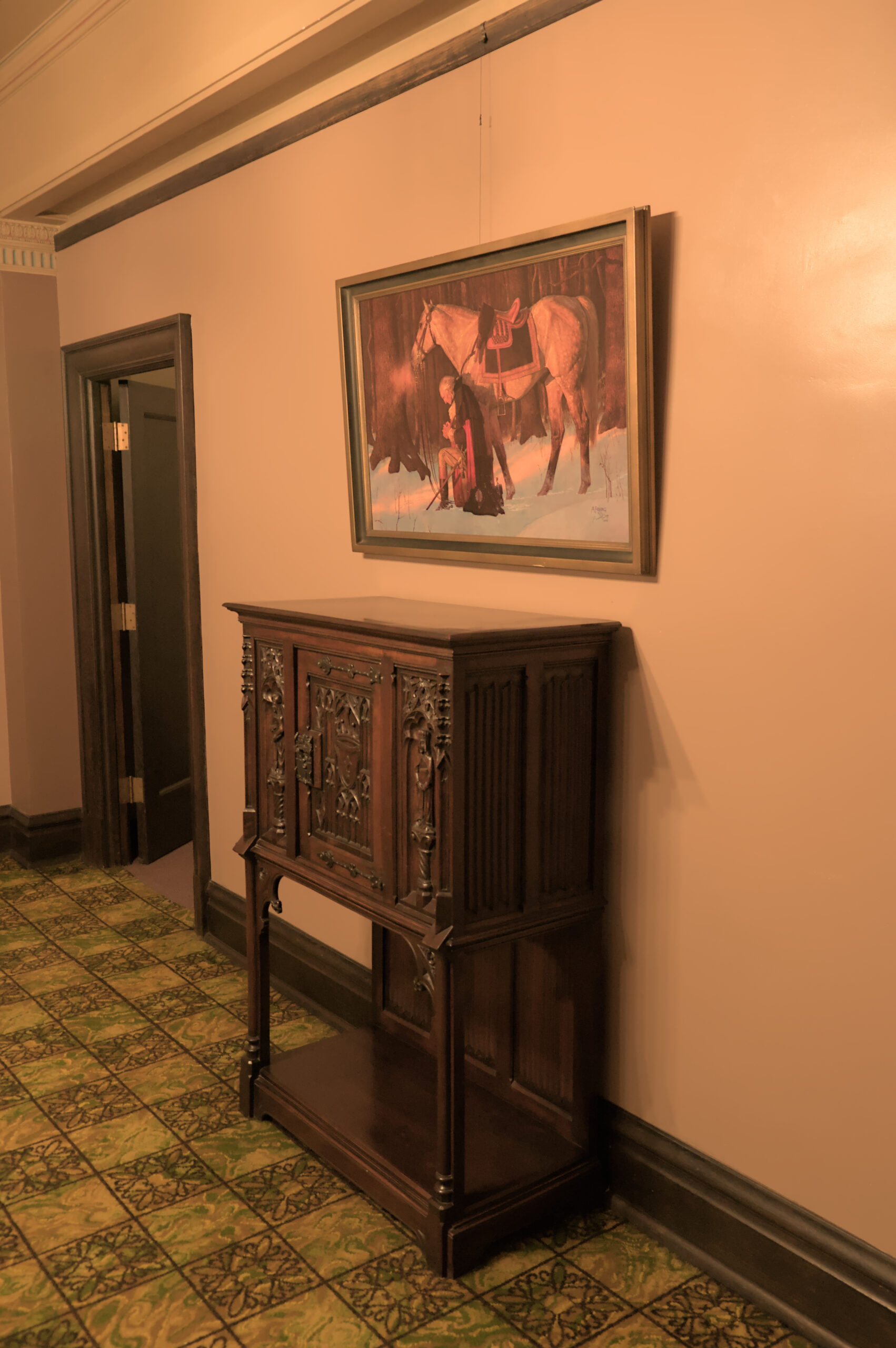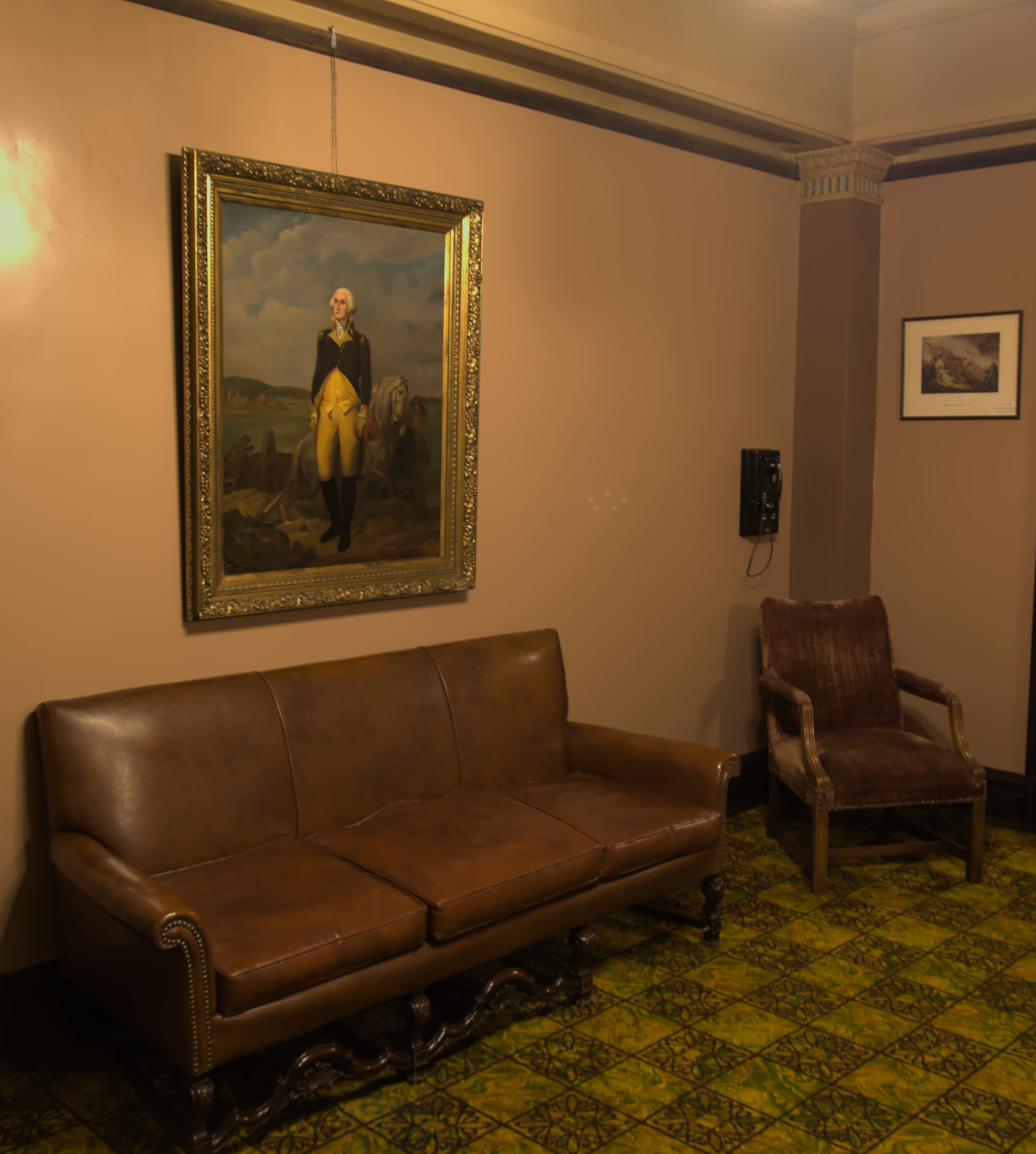 After my favorite room, we headed back to the main Forer, and I found another phone, a picture of George Washington (one that the Mormon’s also like to have in their buildings), and Jamie found out that it takes two hands to close the doors on that cabinet under the painting of George Washington.